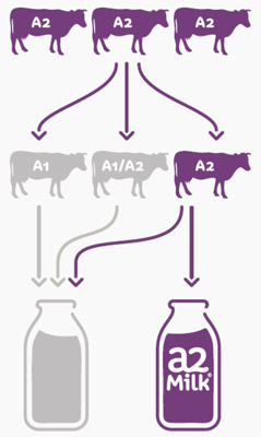 - Công ty sữa A2 làm việc với một số nông dân địa phương để xác định và chứng nhận sản xuất a2 Milk® trong đàn hiện có của họ mà tự nhiên sản xuất sữa chỉ chứa loại protein A2 tinh khiết và không có protein A1.